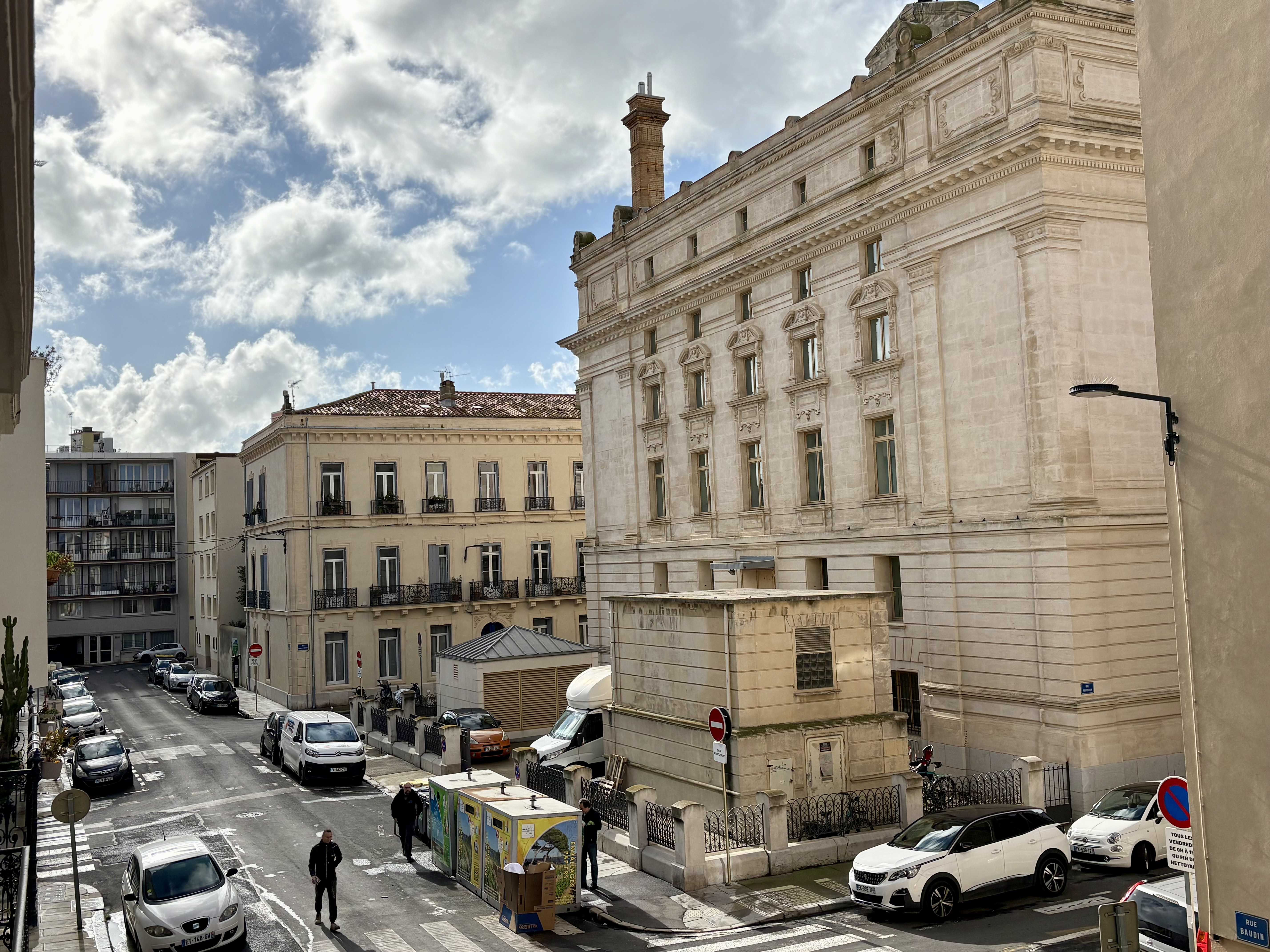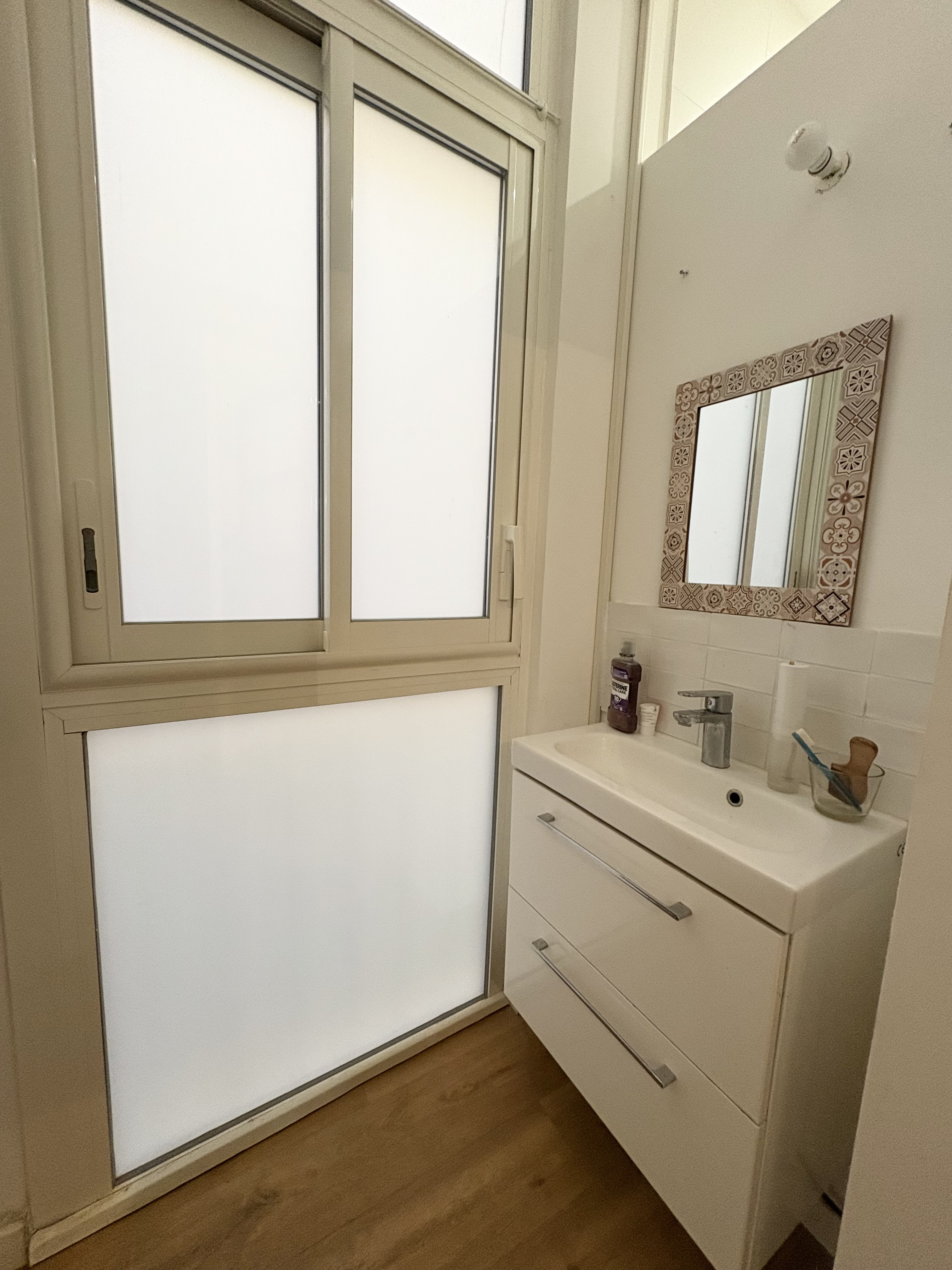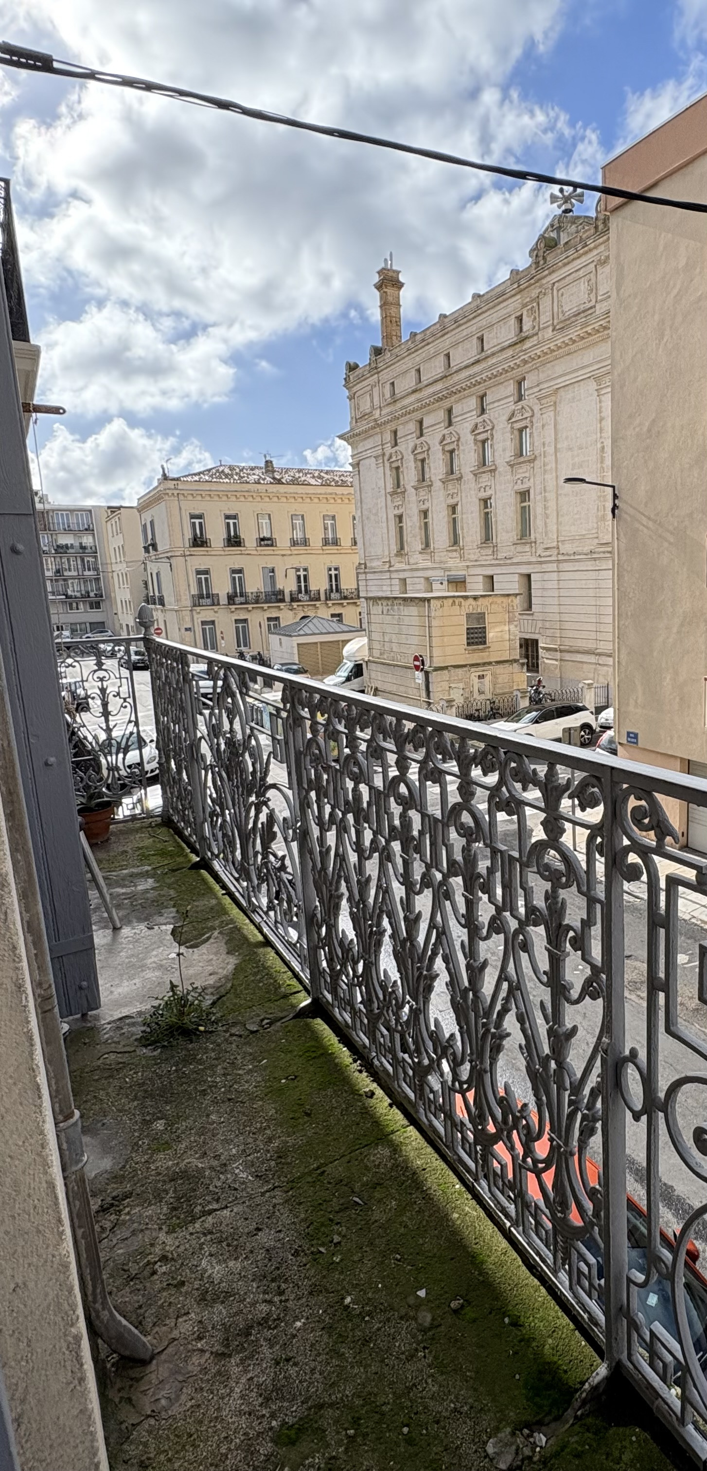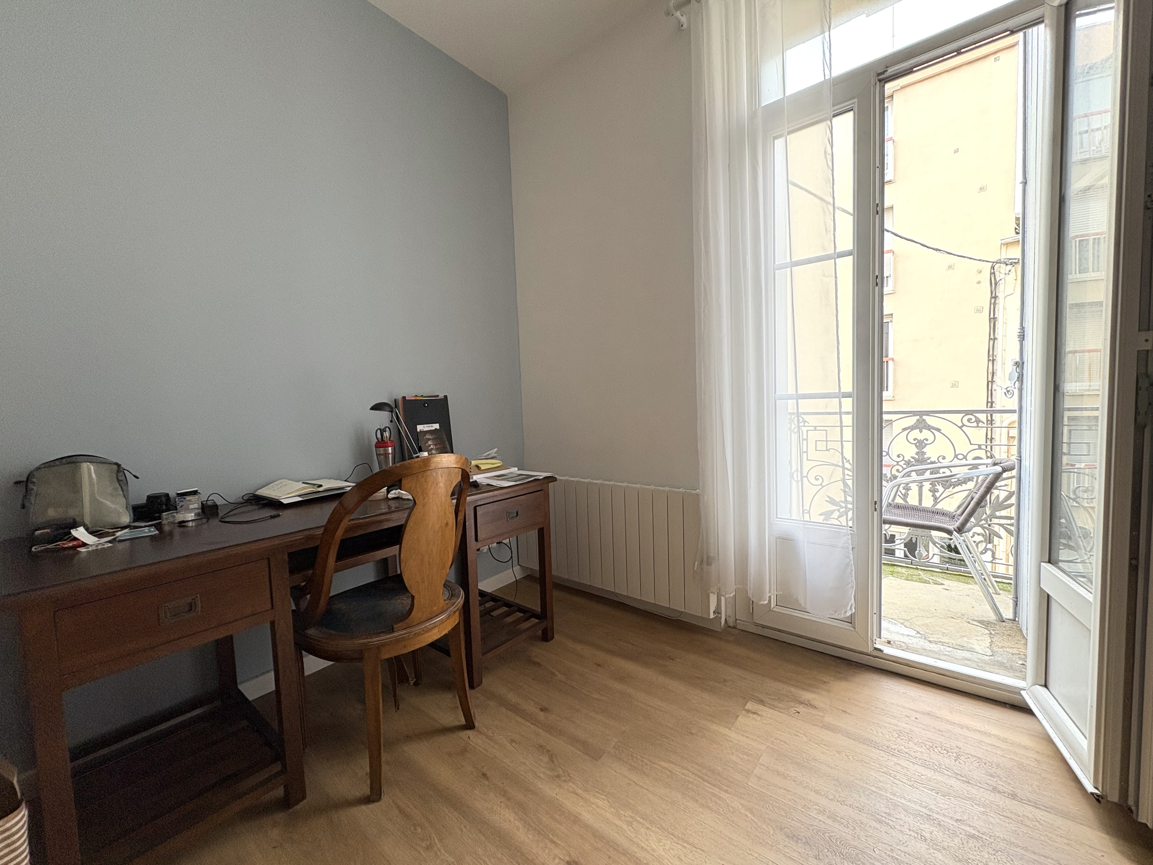 Deux belles portes-fenêtres ouvrent sur un balcon suffisamment large pour installer une chaise et profiter des douces journées ensoleillées, avec une vue dégagée sur le magnifique Théâtre de Sète.